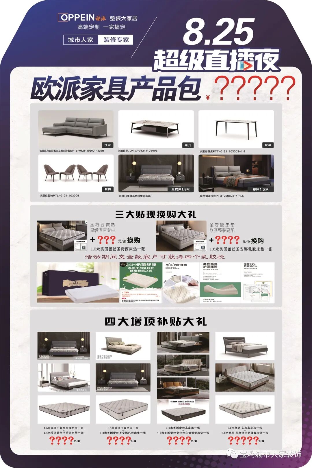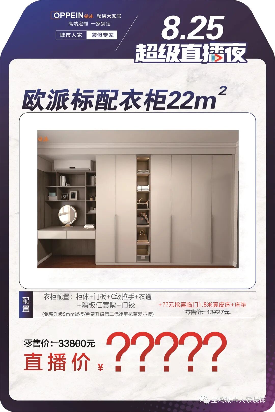 欧派28周年庆 8.25超级直播夜 嗨购家具节,超惠大放送 爆款买赠礼,精装享豪礼 锁定8月25日晚7点 巨额补贴,等你来拿!!! 欧派标配 - 衣柜22m² - 欧派衣柜懂您对家人的爱 给您设计合理的空间布局 助您收纳生活的繁琐之物 帮您营造环保、安全的家 为您定制属于您人生阶段的幸福居所 - 欧派 - 家具产品包 家具十件套 加价换购美国蕾丝床垫 超级补贴价,床加床垫带回家 大牌家具任您选购 超多家具组合 总有一款适合您 - loading - 家电 - 场- 更多惊喜 锁定8月25日晚7点 直播间 我们等您来!!! ● 抢订热线:0917-3154555/180 9149 2746 ● 地址:宝鸡市高新5路宏欣国际14号楼五楼城市人家装饰