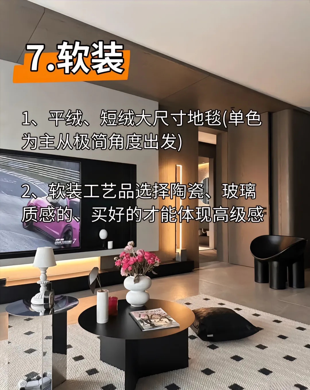 装饰品数量极少,但每一件都精心挑选,如同艺术品。可能是一个意大利品牌的摆件、一个设计独特的单人沙发,或是一盏极具雕塑感的落地灯。