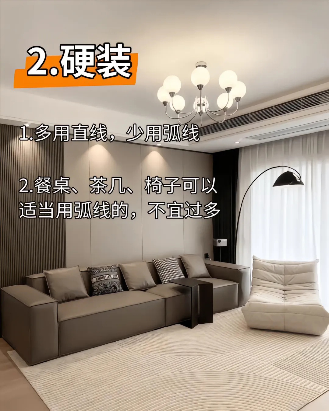 线条 :强调横平竖直的利落线条,无论是天花、墙面还是家具,都追求简洁的几何造型。很少有多余的曲线和复杂的雕花。