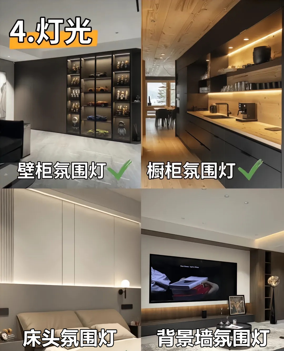 追求无主灯设计,大量使用嵌入式筒灯、射灯、磁吸轨道灯、灯带等。