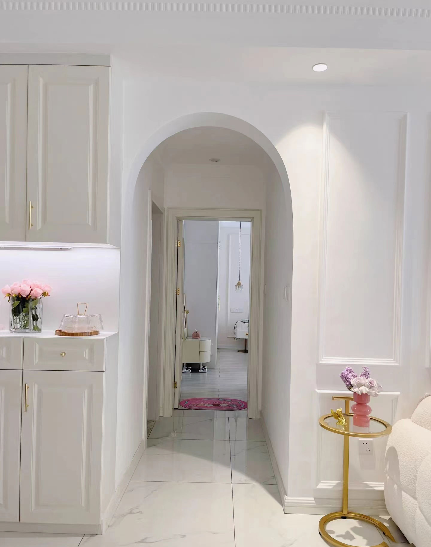 鱼骨拼接地板是法式风格另外一个经典元素了,它能够将几何感表现得很强烈,尤其对于走道好玄关,能起到很好的视觉延伸效果。